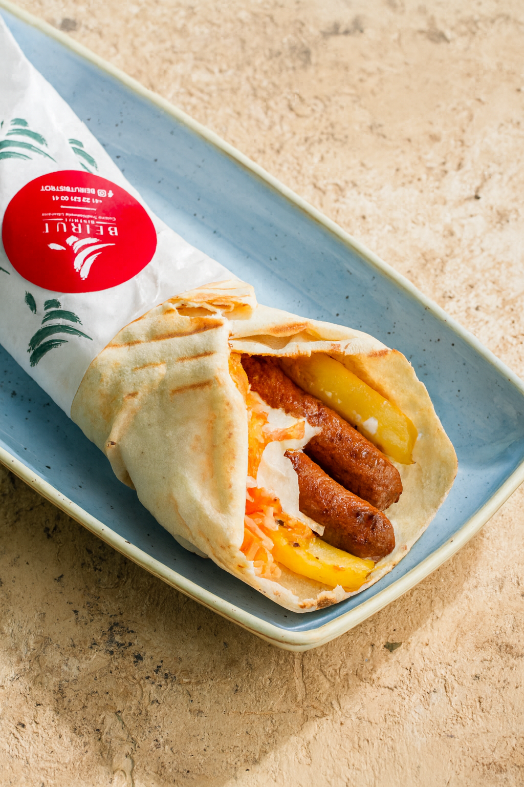 Sandwich makanek CHF 12.00 Petites saucisses libanaises à la viande de boeuf sautées au citron et à la mélasse de grenade.