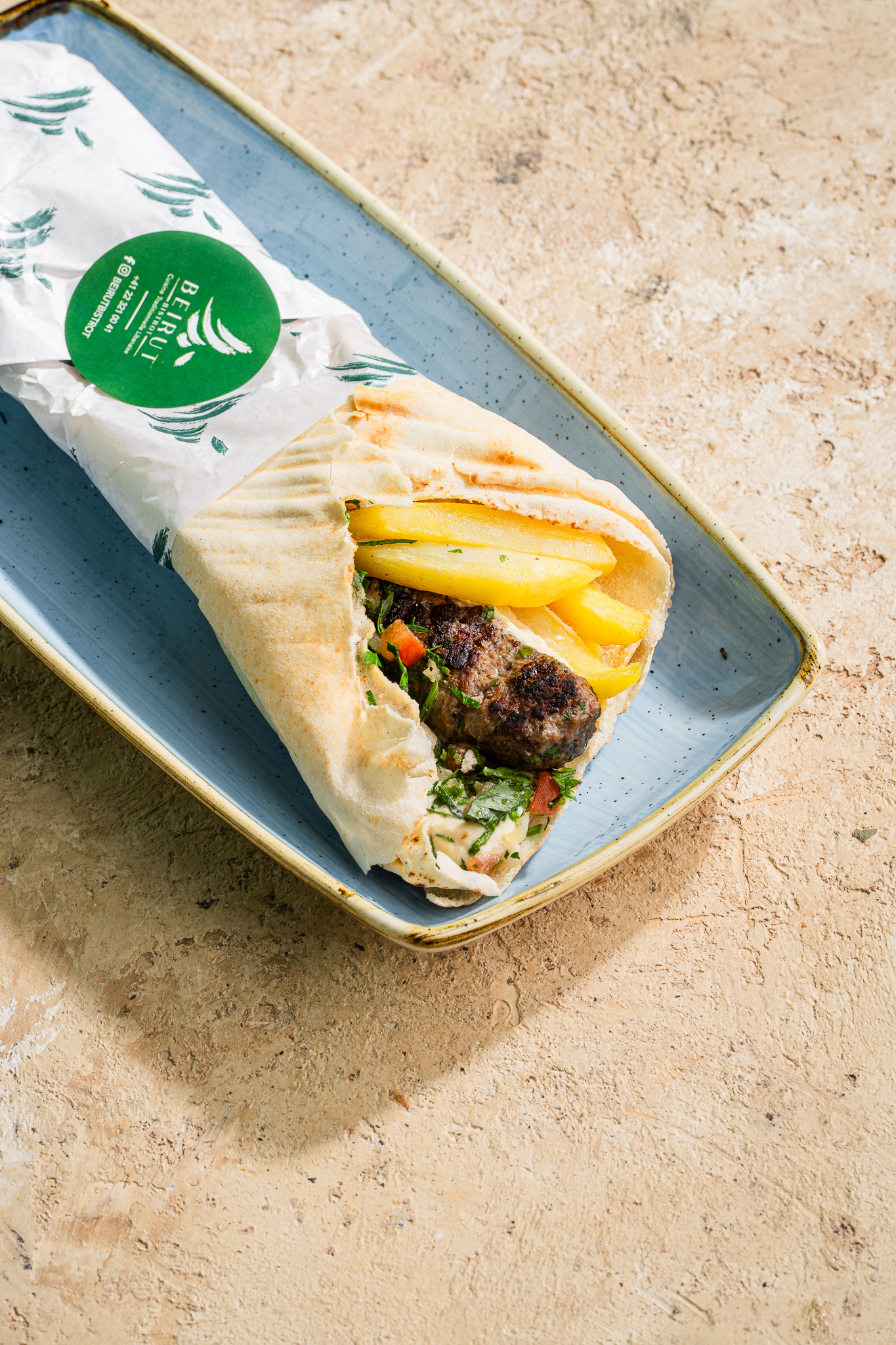Sandwich Kafta CHF 12.00 Brochettes de viande hachée de boeuf et d'agneau aux herbes et épices avec leur salade et hommous.