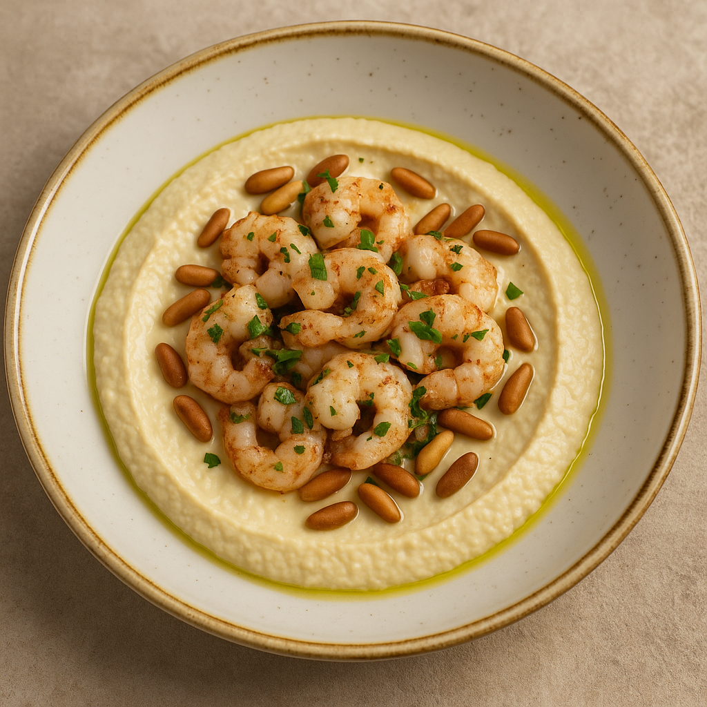 06.Oct By beirutbadmin Hommous aux crevettes Hommous aux crevettes CHF 18.00 Purée de pois chiches, crème de sésame, jus de citron frais, huile d'olive. Crevettes sautées à la provençale, pignons. Share: